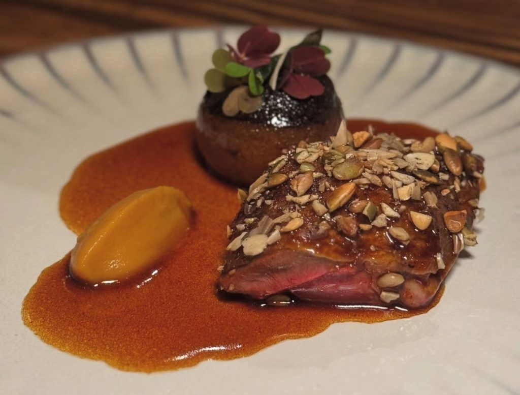 The hearty Roasted Hong Kong Chicken paired with Niigata rice is a study in contrast: the bird with its golden, crispy skin is meticulously prepared with love, undergoing a five-day love affair from brining and pre-cooking to dry aging, ensuring every bite is tender and flavourful, offering a comforting, umami‑rich bite. Equally arresting is the game Pigeon “Fabien D’eneour”. A plump Brittany pigeon with cabbage mille‑feuille and a black pudding made from the innard, its gamey richness tempered by pink‑pepper‑oil‑infused nori and a bright Black Lemon Condiment. The dishes showcase Royer’s sustainability ethos and Portalier’s talent for weaving Asian accents into a French framework.